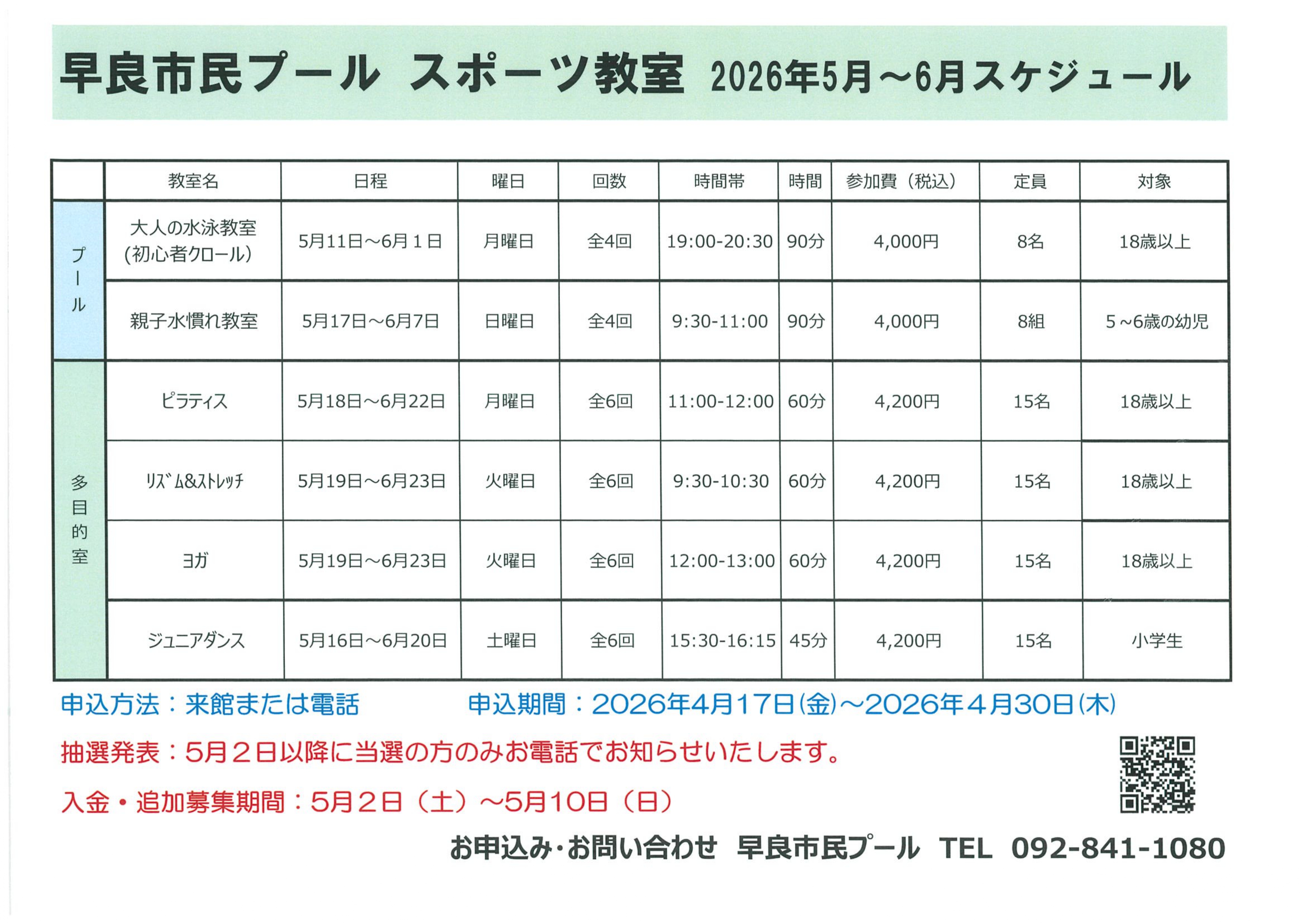 ・申込方法:ご来館またはお電話にて(早良市民プール TEL:092ー841ー1080)